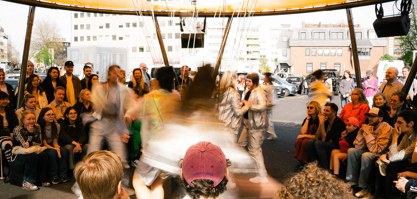 Die theatrale Stadtteilbefragung „DRAUßEN“ initiiert vom Comedia Theater Köln erforscht, wie junge Menschen in Mülheim den Stadtraum gestalten und nutzen. „Draußen“ – das ist der Entenpark, Jugendpark, Müzepark, Frankfurter, Keupstraße und der Böcki. Es ruft uns heraus, macht manchmal Angst, schenkt Begegnungen mit Freund*innen und Fremden. Aus dem partizipativen Prozess entstand eine interaktive Stadtrauminstallation, die Synergien schafft, Passant*innen öffnet und fragt: Wann sind wir drinnen, wann draußen? Sie macht das Wechselspiel von Innen und Außen erfahrbar, versteht sich als Kommunikationsraum und Rückzugsort zugleich. Die Farbe Gelb unterstützt diesen Austausch: atmosphärisch warm, diffus im Raum, löst sie Grenzen auf und markiert den Pavillon als besonderen Ort – einen Raum, der neue Begegnungen ermöglicht, Neugier weckt und Freude vermittelt.